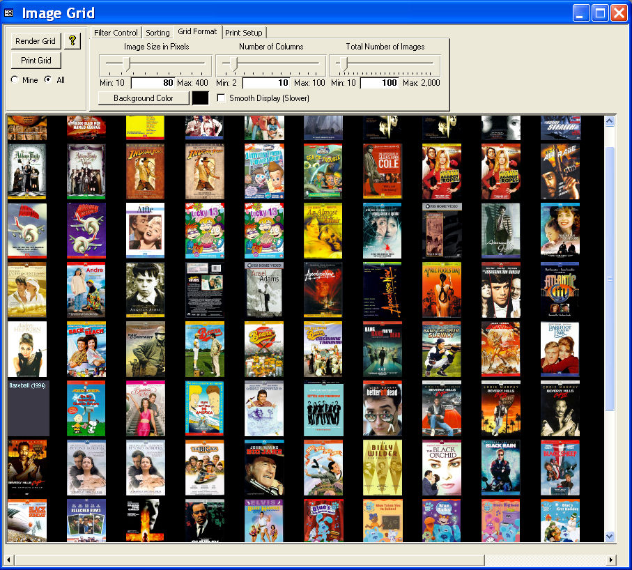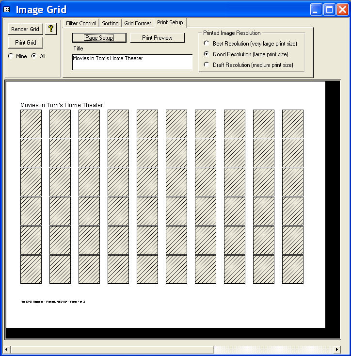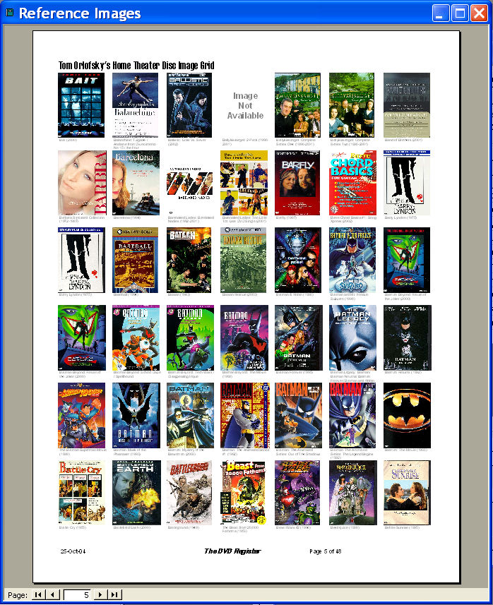 A new form was added to provide an image grid. This form presents an array of cover art image. The size and number of the images displayed can be adjusted at run time. The covers displayed can be filtered based upon, classification, theme, publisher, director, performer, and type of disc. The form retains its setting when closed. A double click on an image will cause the “Discs Form” to track to the title. Right clicking an cover will paint the title, year release, and version on the image. The new form is opened under File>Image Grid. The capability to print the image grid was added as well as a print preview that indicates how the images will be arranged on the printed page. A page setup tab was added to manage the page setup and related printing issues. Printing settings are saved when a form is printed.
