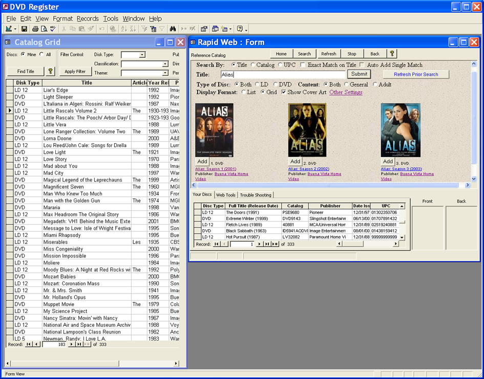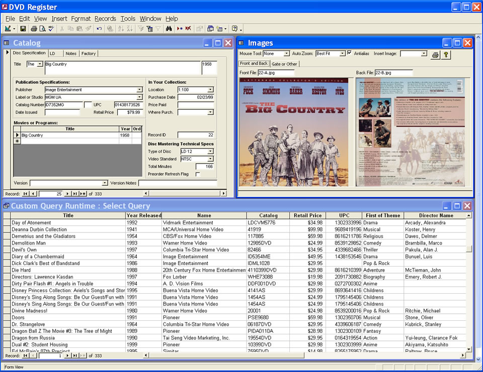 Your catalog is shown in on the upper left and the reference catalog is shown on the lower left in grid format. Cover art for your catalog is shown to the right in grid format. If you double click on an image in the image grid then that title will become selected in the upper left. You can filter the reference catalog on type of disk, theme, publisher, director, or actor.